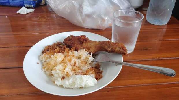 3. Если вы не хотите заморачиваться с готовкой, то можно спокойно и довольно дёшево питаться уличной едой. По утрам с 6 до 9 утра на улицах появляются лавки с жареной курицей в панировке, с рисом и кисло-сладким соусом. Кусок курицы в зависимости от части тушки стоит от 15 до 30 бат, порция риса 10 бат, соус бесплатно. На двоих завтрак нам обходился примерно в 60 бат, т.е. примерно 130 рублей.