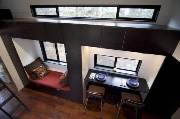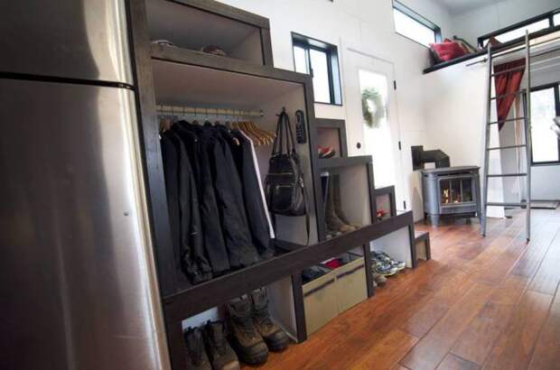 Morrisons – семейная пара, проживающая в небольшом, но вполне уютном домике стоимостью всего в 22 000 долларов. Жилая постройка оснащена всеми необходимыми удобствами. Сооружение располагается на 207 квадратных футах. В доме есть просторная кухня с духовкой, раковиной и холодильником. Небольшой стол используется как обеденный атрибут, а также в качестве офисного предмета мебели. Находчивые хозяева постарались с умом использовать внутреннее пространство дома и разместили под лестницей вместительный шкаф.